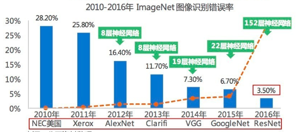 技術驅動階段集中誕生了基礎理論、基本規(guī)則和基本開發(fā)工具。在此階段,算法和計算力對AI的發(fā)展起到主要推動作用?,F(xiàn)在主流應用的基于多層網(wǎng)絡神經(jīng)的深度算法,一方面不斷加強從海據(jù)庫中自行歸納物體特征的能力,一方面不斷加強對新事物多層特征提取、描述和還原的能力。對算法來說,歸納和演繹同樣重要,最終目的是提高識別效率。最新ImageNet測試結果顯示,AI錯誤率低達3.5% ,而人類對同一數(shù)據(jù)庫識別錯誤率在5.1%,理想情況下,計算機圖像識別能力已超越人類。