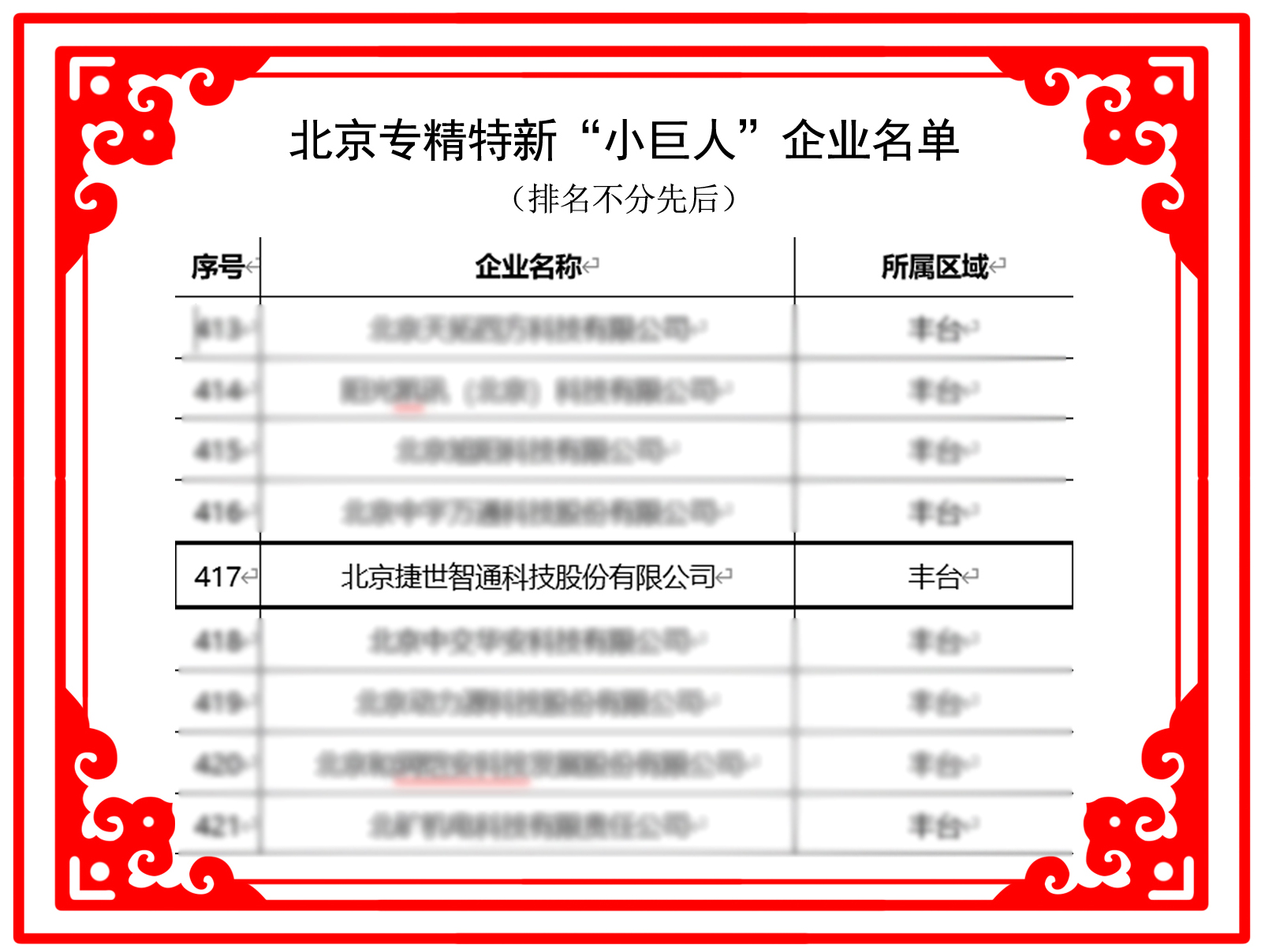 近期,北京市經(jīng)濟(jì)和信息化局公示了2021年度第二批北京市專精特新“小巨人”企業(yè)名單,捷世智通成功入選,榮登榜單。這是繼2021年度北京市專精特新企業(yè)認(rèn)定后的再升級,是捷世虎年開局的精彩表現(xiàn)之一。